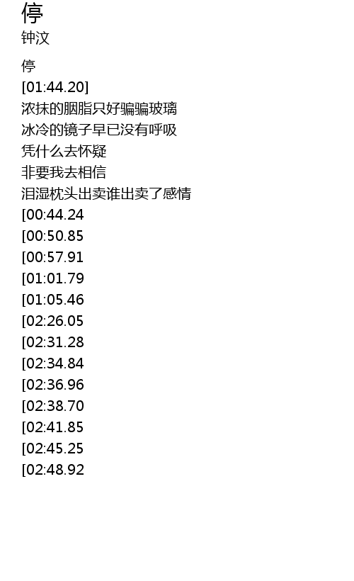 | [03:10.36][02:41.85][01:28.65] | 停 不看不听也不理 |