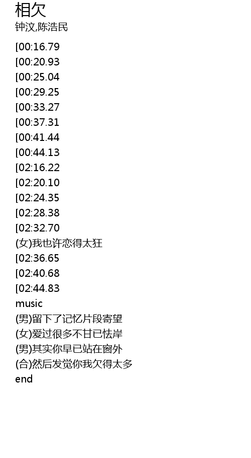 | [01:43.41][00:16.79] | (女)又欠太多 总不知不觉 |