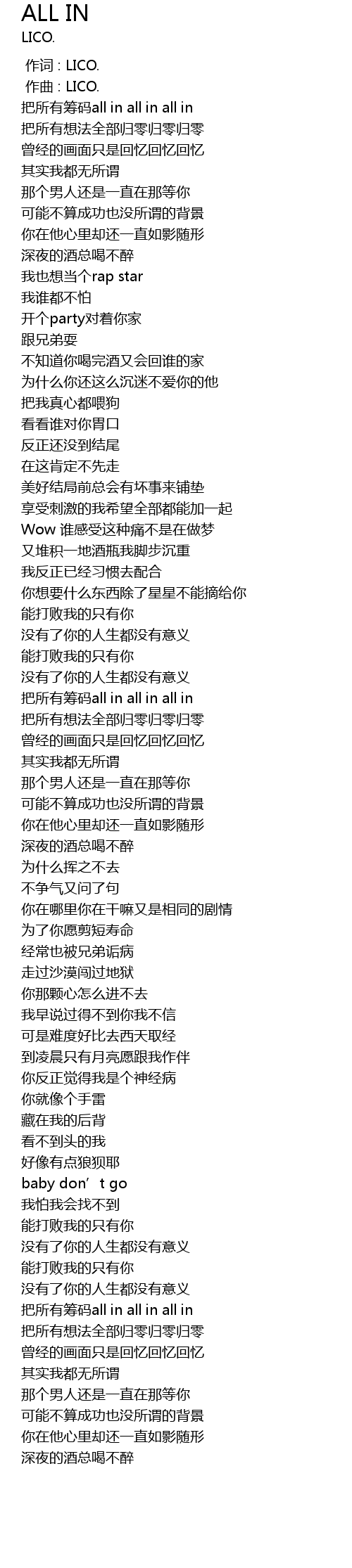 | [01:32.494] | bǎ suǒ yǒu chóu mǎ all in all in all in |