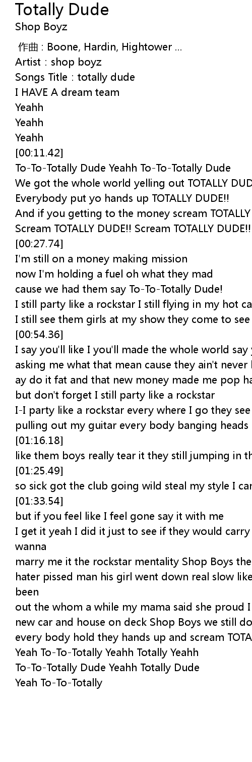 | [02:04.77] | To-To-Totally Dude Yeahh Totally Dude |