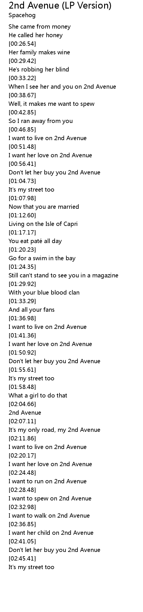 | [02:30.35] | I want to spew on 2nd Avenue |