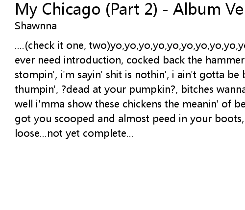 ....(check it one, two)yo,yo,yo,yo,yo,yo,yo,yo,yo,yo,yo,yo,yo,yo...it's rarely i ever need introduction, cocked back the hammer and ram the ???, timbaland's get stompin', i'm sayin' shit is nothin', i ain't gotta be bluffin', ya may not be thumpin', ?dead at your pumpkin?, bitches wanna get a piece of me in the booth, well i'mma show these chickens the meanin' of bein' the truth, and now my niggas got you scooped and almost peed in your boots, and now your pockets gettin' loose...not yet complete... |