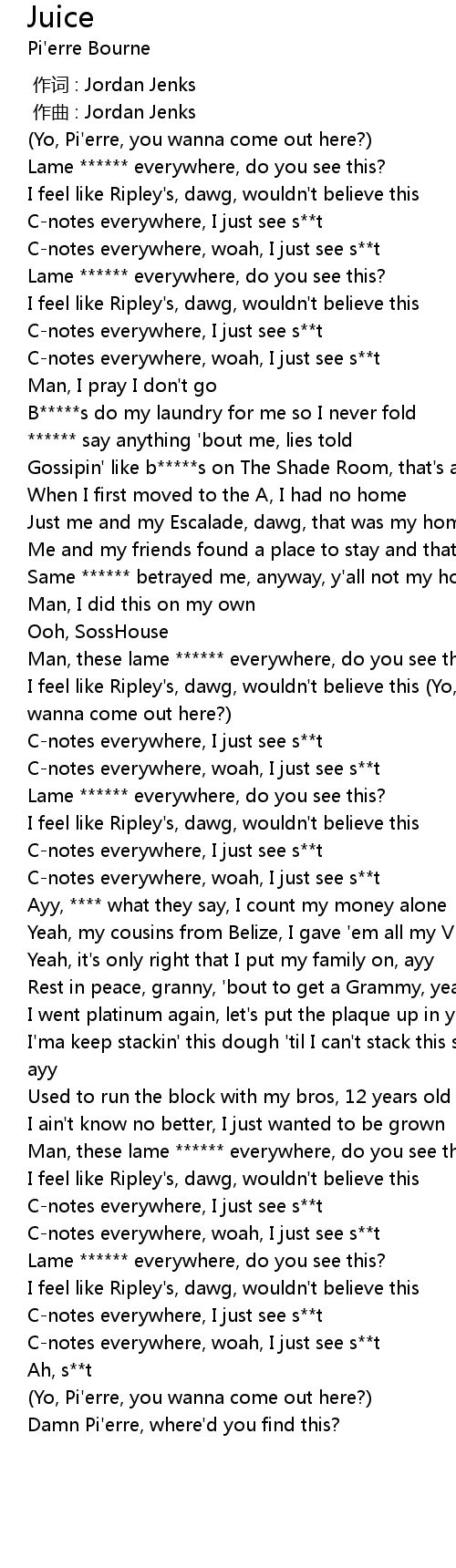 | [00:49.996] | I feel like Ripley's, dawg, wouldn't believe this (Yo, Pi'erre, you wanna come out here?) |