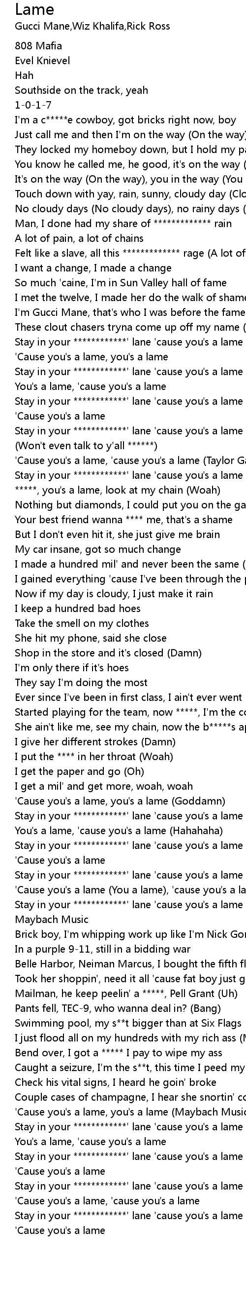 [02:36.17] Stay in your ************' lane 'cause you's a lame (1017, double M)