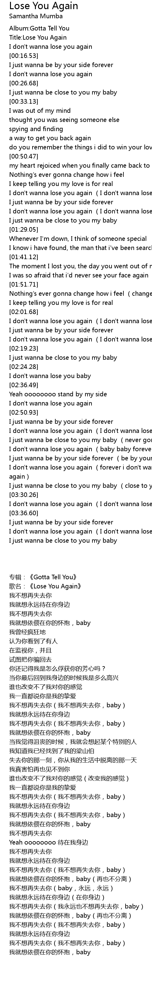 | [03:31.97] | I don' t wanna lose you again I don' t wanna lose you baby |