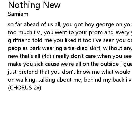 so far ahead of us all, you got boy george on your wall just admit it, you watch too much t.v., you went to your prom and every year you went to summer camp my girlfriend told me you liked it too i've seen you dancing with the hippies in peoples park wearing a tie-died skirt, without any shoes (CHORUS) you're nothing new that's all (4x) i really don't care when you see me on the street i know i make you sick cause we're all on the outside i guess that means you're in so just pretend that you don't know me what would your real friends say just keep on walking, talking about me, behind my back i've only got one thing to say (CHORUS 2x) |