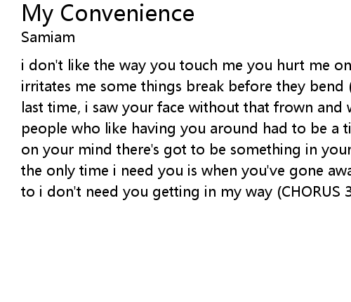 i don't like the way you touch me you hurt me once again something about you irritates me some things break before they bend (CHORUS) i can't remember the last time, i saw your face without that frown and would you believe there's people who like having you around had to be a time when there were good things on your mind there's got to be something in your life that's worked out right the only time i need you is when you've gone away i just want somebody to talk to i don't need you getting in my way (CHORUS 3x) |