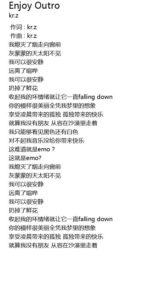 | [00:39.238] | 收起我的坏情绪就让它一直falling down |