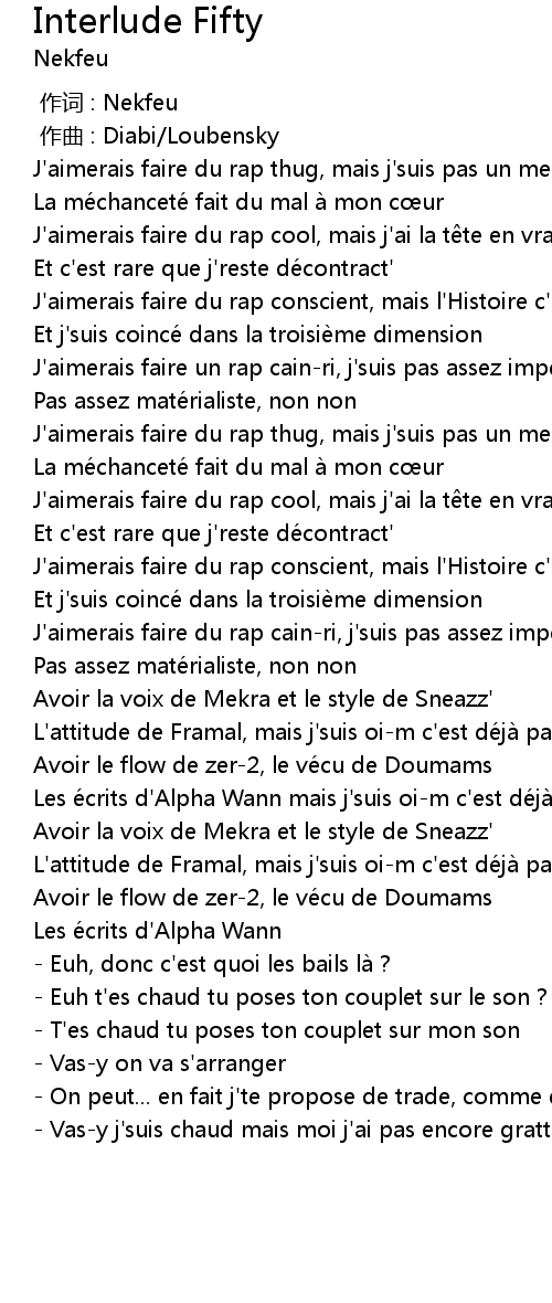 | [00:47.36] | J'aimerais faire du rap cain-ri, j'suis pas assez impérialiste |