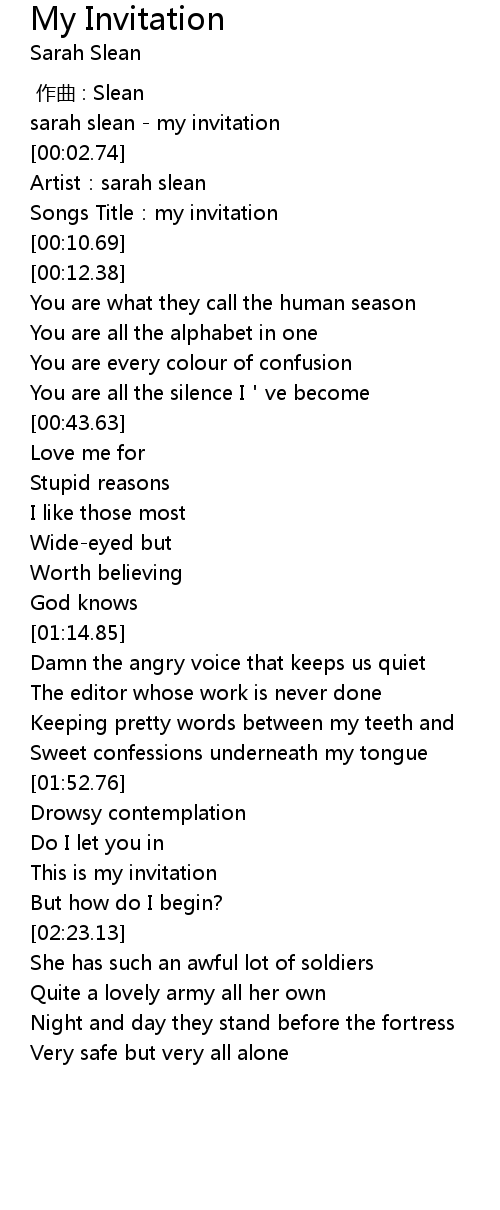 | [00:00.80] | sarah slean my invitation |