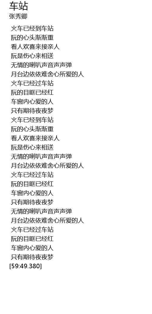 | [01:02.730] | 月台边依依难舍心所爱的人 |
