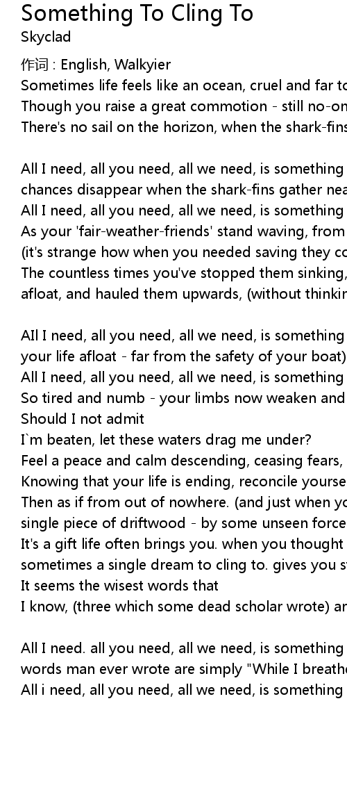 | AIl I need, all you need, all we need, is something to cling to Fight to keep your life afloat far from the safety of your boat | |