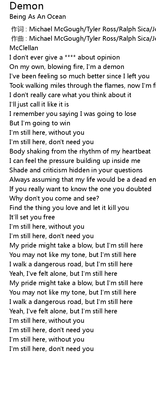 | [00:25.725] | On my own, blowing fire, I' m a demon |