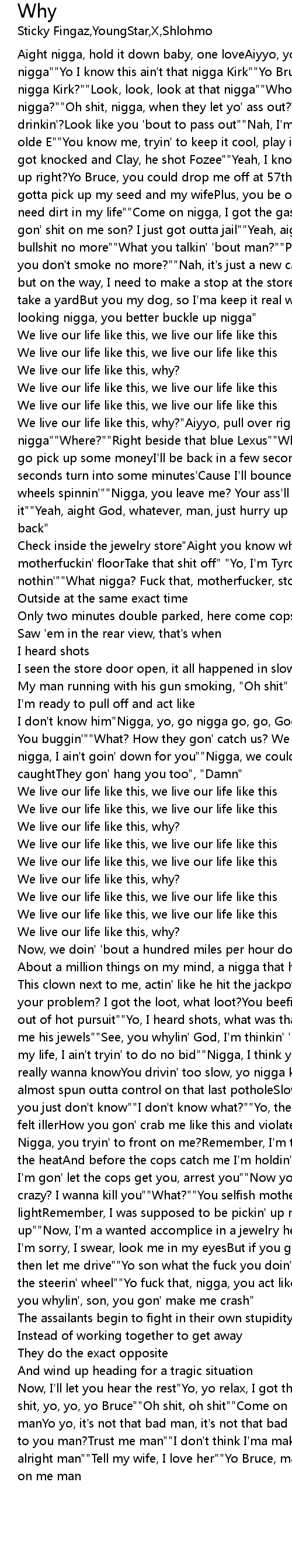 We live our life like this, why?"Aiyyo, pull over right there nigga""Where?""Right beside that blue Lexus""Where you're goin'?""I just gotta go pick up some moneyI'll be back in a few seconds""Yeah aight, don't let a few seconds turn into some minutes'Cause I'll bounce on you nigga, tires burnin' wheels spinnin'""Nigga, you leave me? Your ass'll never hear the end of it""Yeah, aight God, whatever, man, just hurry up and cut the bullshit""I'll be back" |