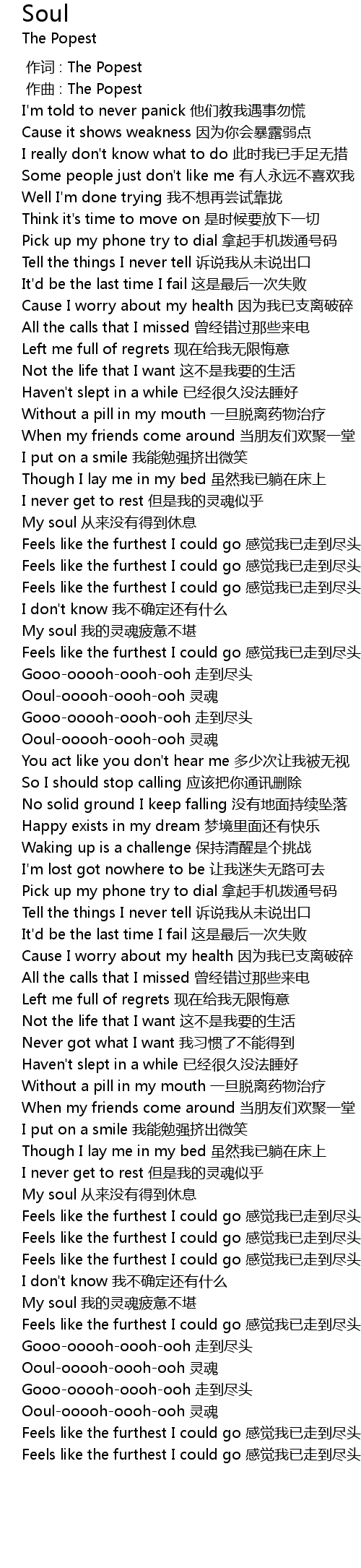 | [02:22.89] | I never get to rest dàn shì wǒ de líng hún sì hū |