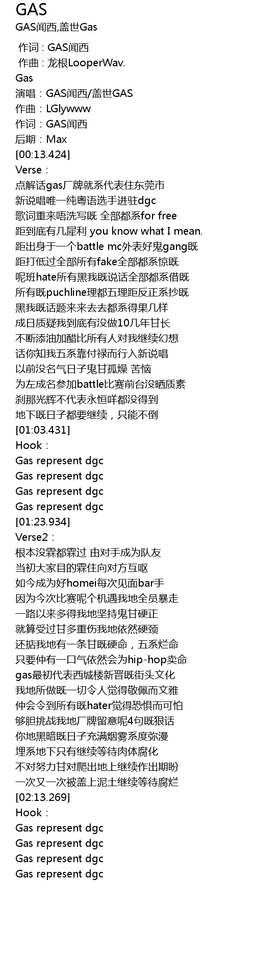 | [00:04.172] | 演唱:GAS闻西/盖世GAS |