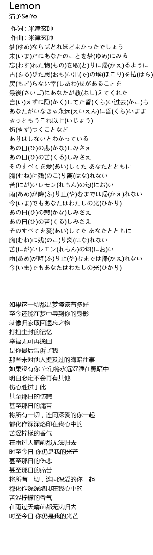 | [02:17.707] | 苦(にが)いレモン(れもん)の匂(にお)い |