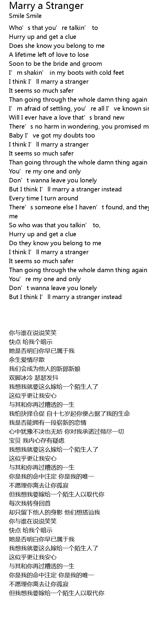 | [01:33.340] | But I think I' ll marry a stranger instead |