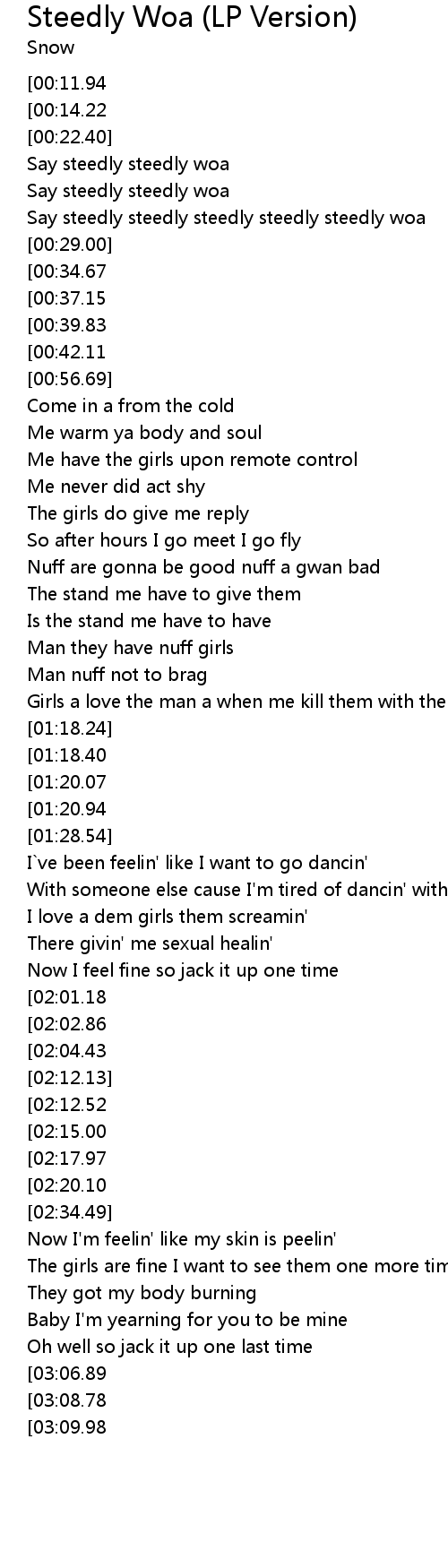 | [03:13.92][03:08.78] | Say steedly steedly woa |