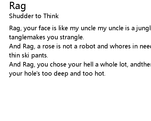 | Rag, your face is like my uncle my uncle is a jungle a jungle is a tangle a tanglemakes you strangle. | |