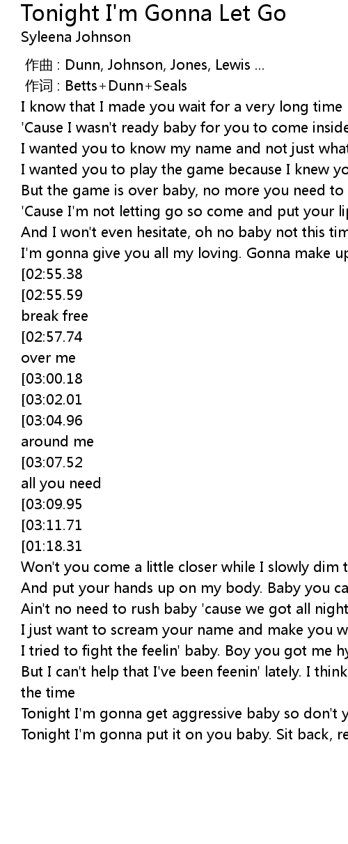 | [03:31.13][03:11.71][02:52.29][02:13.51][01:15.32] | Tonight I' m gonna let go |