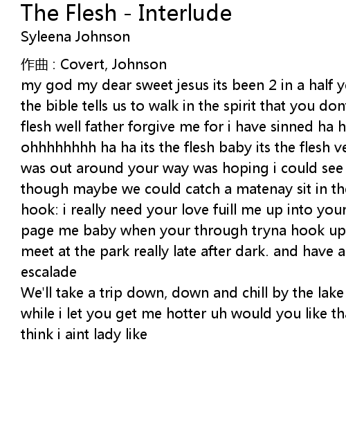 | my god my dear sweet jesus its been 2 in a half years since my last confession the bible tells us to walk in the spirit that you dont fullfill the lust of your flesh well father forgive me for i have sinned ha ha ha ha haaaaaaaaa ha ohhhhhhhh ha ha its the flesh baby its the flesh verse 1: hey baby how your day? was out around your way was hoping i could see ya got something to give ya though maybe we could catch a matenay sit in the 69th row and act invisible hook: i really need your love fuill me up into your cup can i hook up wit you page me baby when your through tryna hook up wit you verse2: uh listen uh we can meet at the park really late after dark. and have an escapade in your new escalade | |