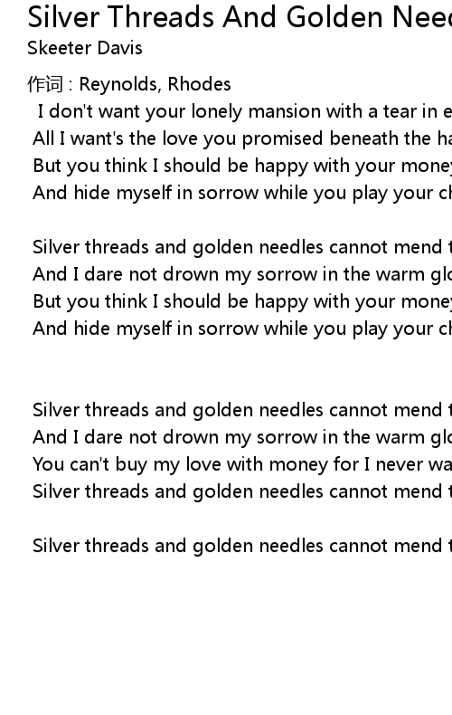 | 歌曲 | Silver Threads And Golden Needles |