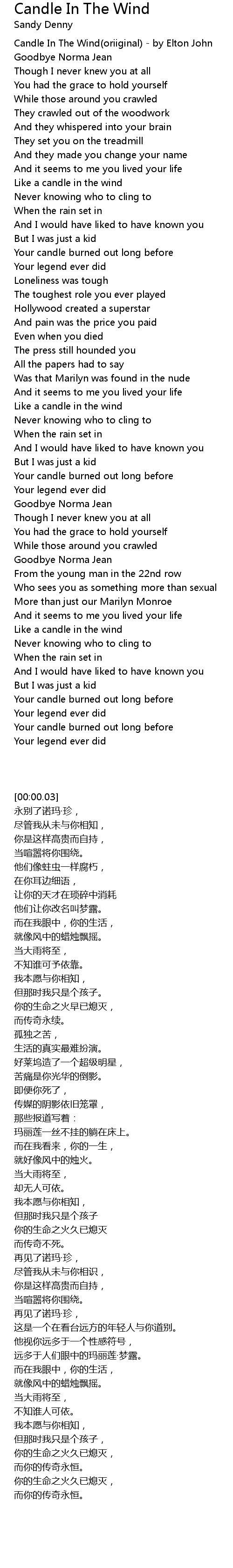 [00:00.03] Candle In The Wind(oriiginal) - by Elton John