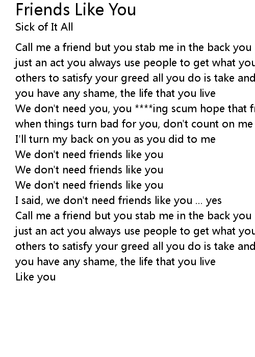Call me a friend but you stab me in the back you pretend we get along, it's all just an act you always use people to get what you need you take advantage of others to satisfy your greed all you do is take and you never once give don't you have any shame, the life that you live |