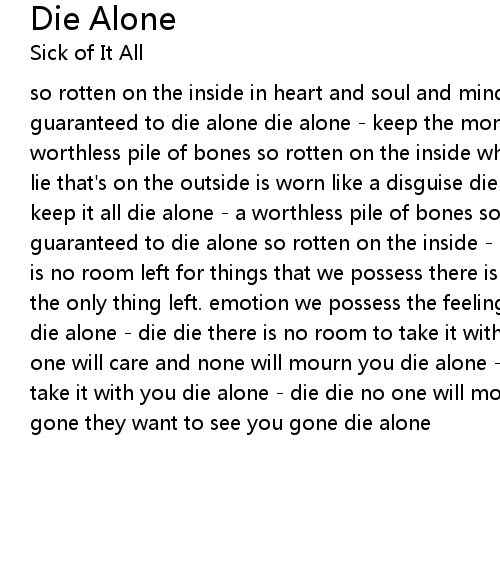 so rotten on the inside in heart and soul and mind so rotten on the inside guaranteed to die alone die alone - keep the money. keep it all die alone - a worthless pile of bones so rotten on the inside where all the truth hides the lie that's on the outside is worn like a disguise die alone - keep the money. keep it all die alone - a worthless pile of bones so rotten on the inside - guaranteed to die alone so rotten on the inside - guaranteed to die alone there is no room left for things that we possess there is no room to take it with you the only thing left. emotion we possess the feelings that would love or hate you die alone - die die there is no room to take it with you die alone - die die no one will care and none will mourn you die alone - die die you have no room to take it with you die alone - die die no one will mourn. they want to see you gone they want to see you gone die alone |