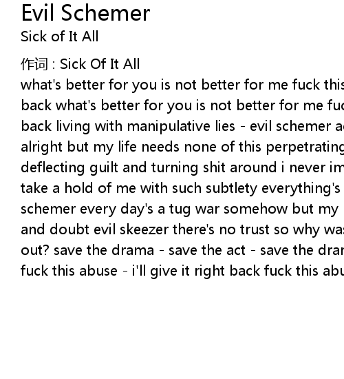 | what' s better for you is not better for me fuck this abuse. i' ll give it right back what' s better for you is not better for me fuck this abuse. i' ll give it back living with manipulative lies evil schemer acting like dysfunction is alright but my life needs none of this perpetrating style evil skeezer master of deflecting guilt and turning shit around i never imagined complete control could take a hold of me with such subtlety everything' s a power struggle now evil schemer every day' s a tug war somehow but my life needs none of this disrespect and doubt evil skeezer there' s no trust so why waste time trying to work things out? save the drama save the act save the drama stop before i fuckin' crack fuck this abuse i' ll give it right back fuck this abuse i' ll give it back |