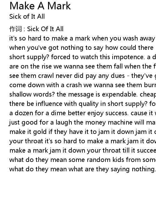 | it' s so hard to make a mark when you wash away it' s so hard to be remembered when you' ve got nothing to say how could there be influence with quality in short supply? forced to watch this impotence. a dozen for a dime when the frauds are on the rise we wanna see them fall when the frauds are flying high we wanna see them crawl never did pay any dues they' ve got a lot to learn when they come down with a crash we wanna see them burn how can we deeply moved by their shallow words? the message is expendable. cheap and mass produced how could there be influence with quality in short supply? forced to watch this impotence. a dozen for a dime better enjoy success. cause it won' t last that kind of ego is just good for a laugh the money machine will make it grow will hit a nerve and make it gold if they have it to jam it down jam it down your throat jam it down your throat it' s so hard to make a mark jam it down your throat it' s so hard to make a mark jam it down your throat till it succeeds where they do come from what do they mean some random kids from some random scene what do they stand for what do they mean what are they saying nothing. nothing |