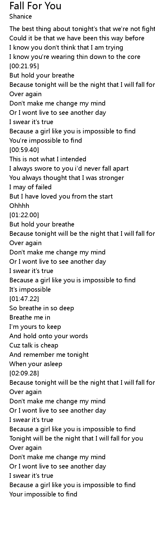 | [01:24.65] | Because tonight will be the night that I will fall for you |