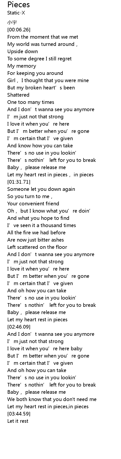 | [03:28.40] | Let my heart rest in pieces, in pieces |