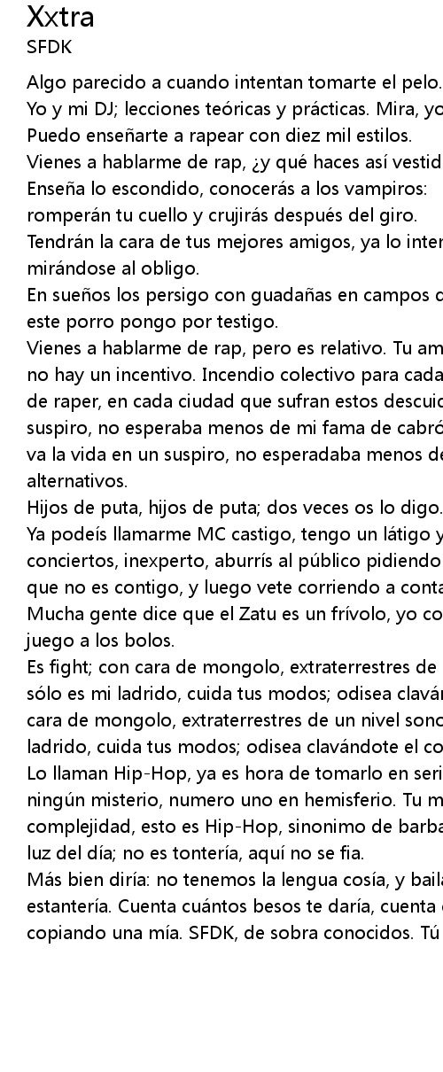 | Ma s bien diri a: no tenemos la lengua cosi a, y bailamos claque en tu estanteri a. Cuenta cua ntos besos te dari a, cuenta cua ntos MC cuentan cuentos copiando una mi a. SFDK, de sobra conocidos. Tu ponte a tiro, lleno de estilo. |