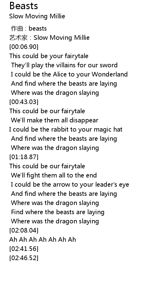 | [01:55.77] | Find where the beasts are laying |