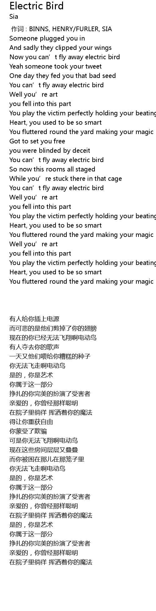 | [00:20.510] | Now you can' t fly away electric bird |