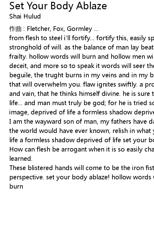 | These blistered hands will come to be the iron fist that bestows true and proper perspective. set your body ablaze! hollow words will burn and hollow men will burn |