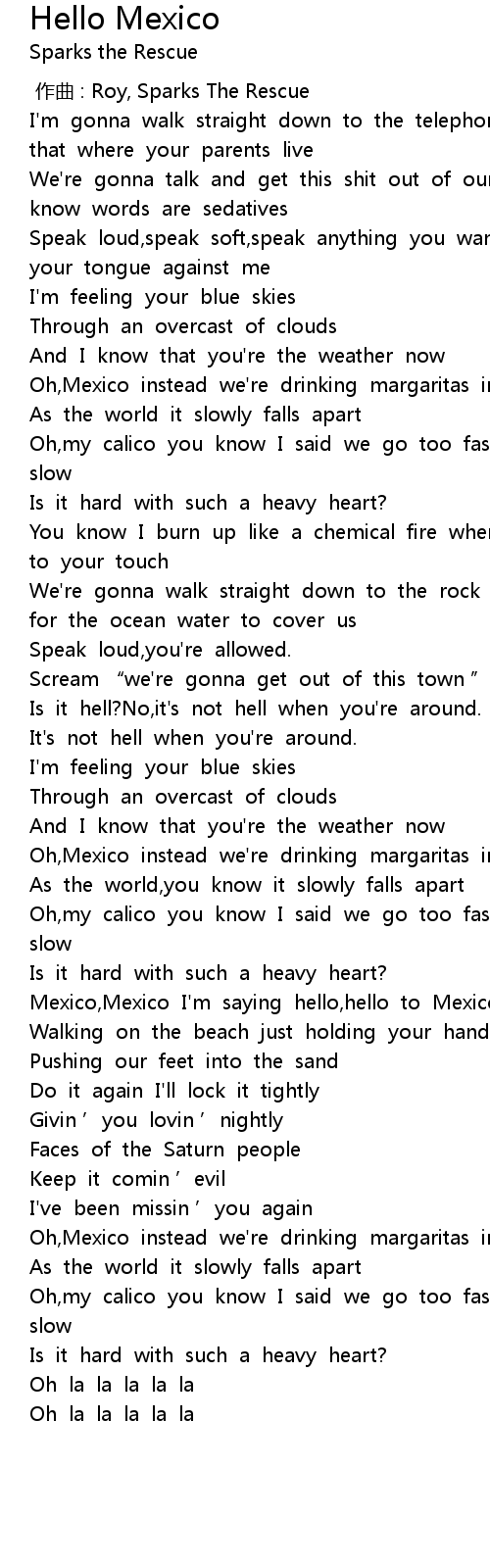 | [02:21.494] | Mexico, Mexico I' m saying hello, hello to Mexico |