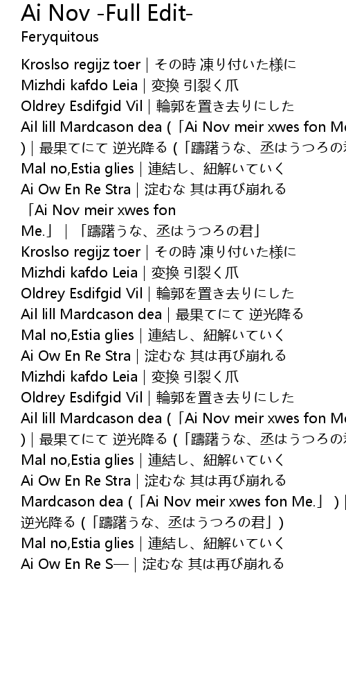 | [01:33.817] | Ail lill Mardcason dea (「Ai Nov meir xwes fon Me.」 )|最果てにて 逆光降る (「躊躇うな、丞はうつろの君」) |