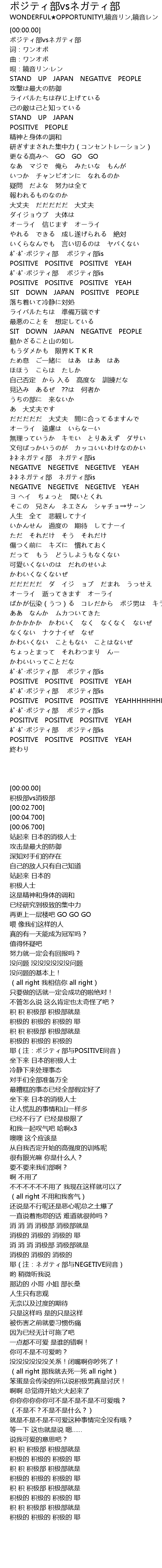 | [02:36.699] | 消极的 消极的 消极的 耶(注:ネガティ部与NEGETIVE同音) |