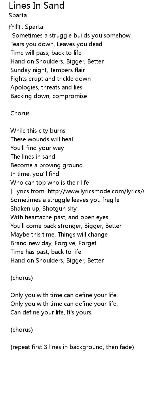 | [ Lyrics from: http://www.lyricsmode.com/lyrics/s/sparta/lines_in_sand.html ] | |
