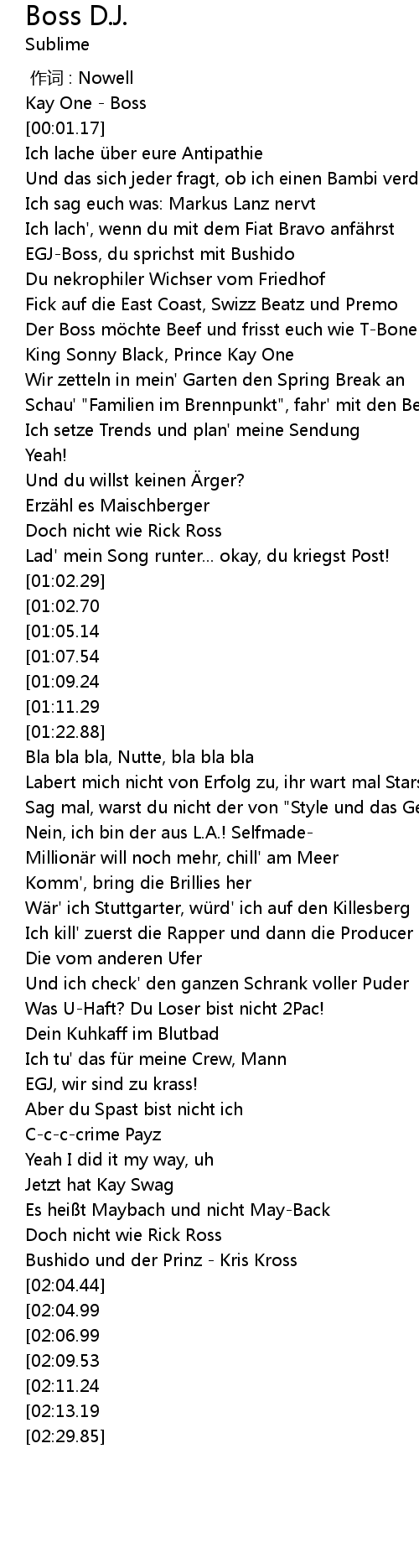 | [00:38.57] | Der Boss möchte Beef und frisst euch wie T-Bone |