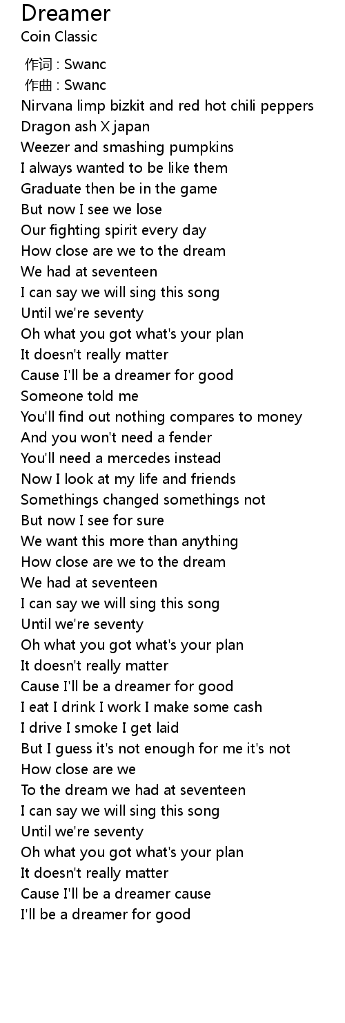 | [01:51.470] | Cause I' ll be a dreamer for good |