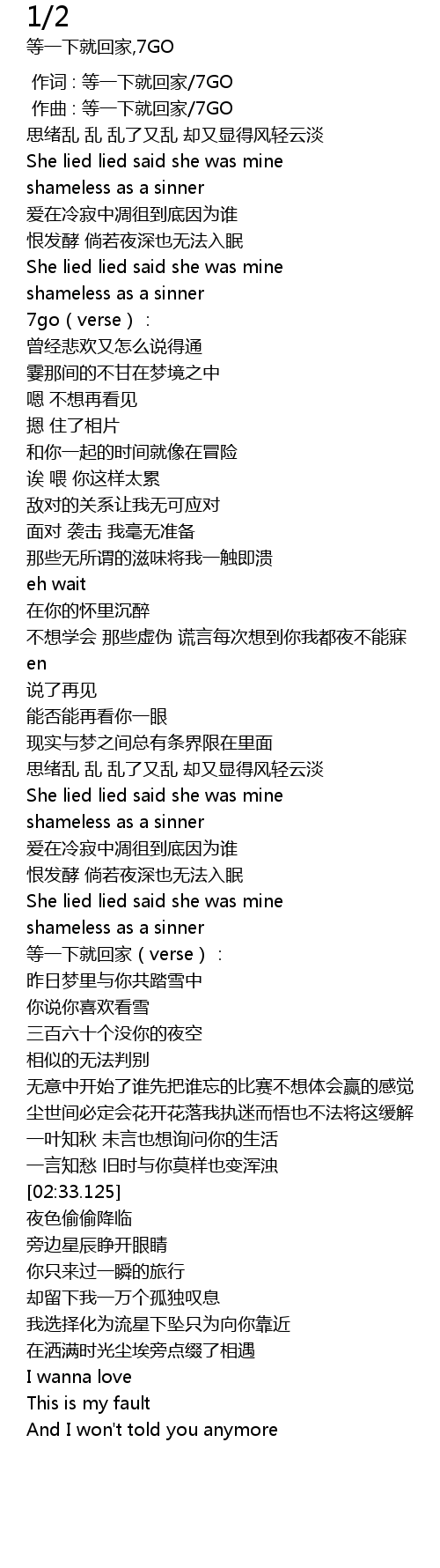 | [00:00.000] | 作词 : 等一下就回家/7GO |