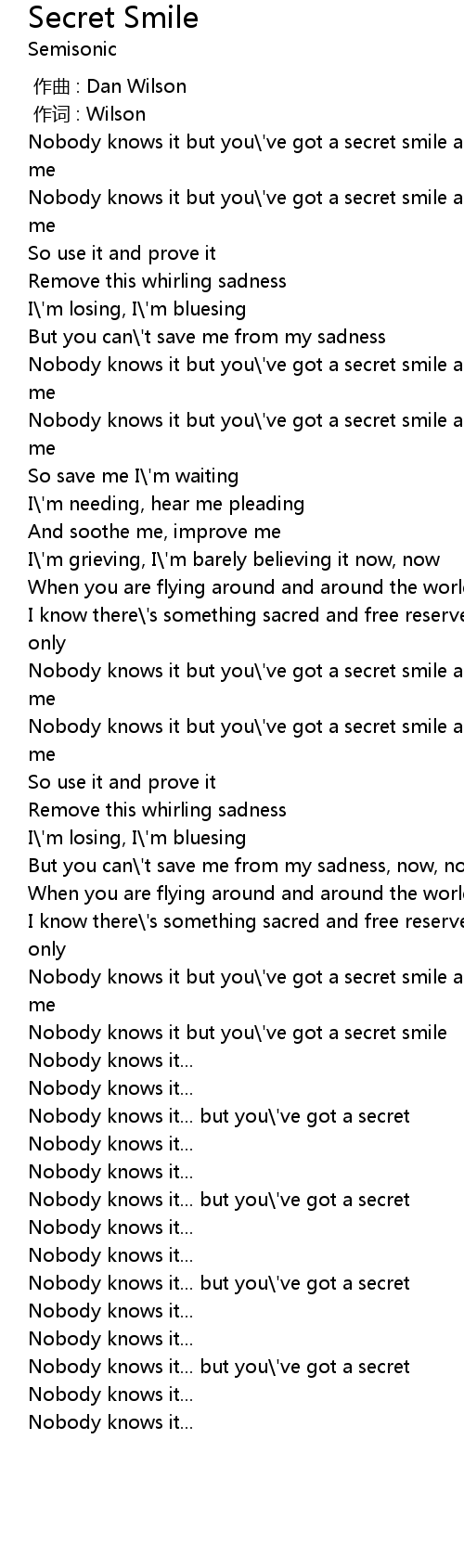 | [03:12.50] | Nobody knows it but you\'ve got a secret smile and you use it only for me |