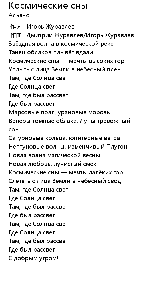 Космические сны 歌词