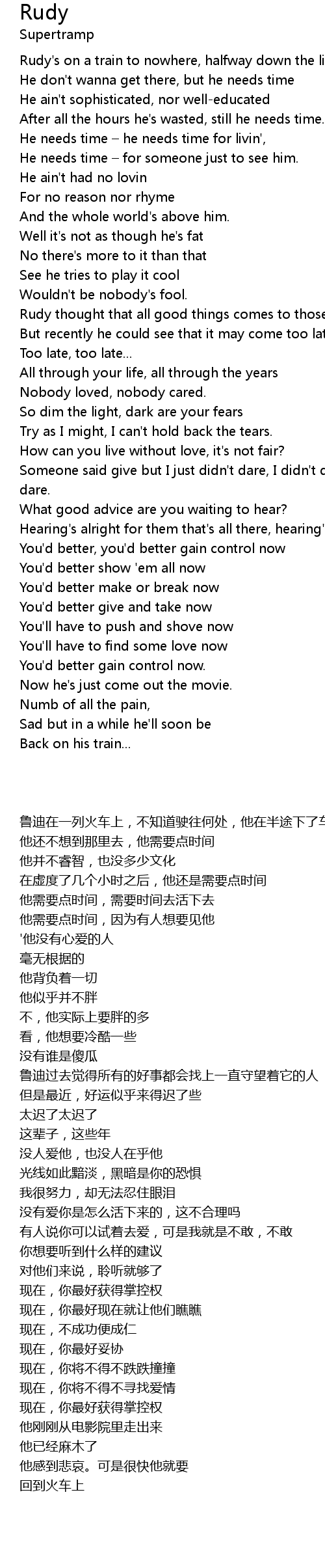 | [00:38.73] | Rudy's on a train to nowhere, halfway down the line |