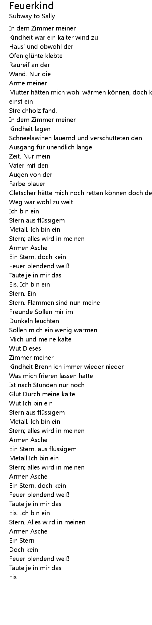 | Mutter hätten mich wohl wärmen können, doch kam sie mich nie besuchen bis ich einst ein | |