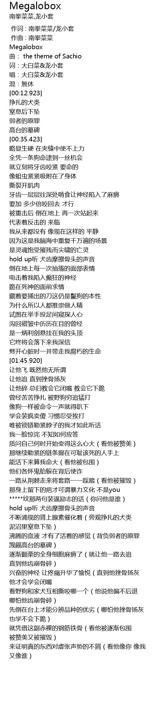 | [00:07.420] | 词:大白菜&龙小套 |
